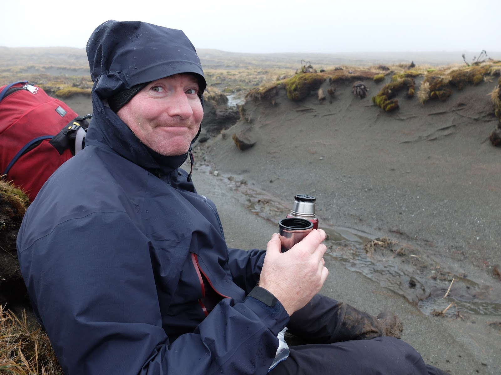 | I'm a little unsure what to do with the walking poles in the early stages of the tramp, although by the end their value has become clear (poking around ahead of you to try to avoid falling into rather large mud-holes, and hauling yourself out of the same holes when your poking fails). I'm also sporting a pair of laboratory glasses, as hours of sand and sleet blowing into your eyes is quite unpleasant. |